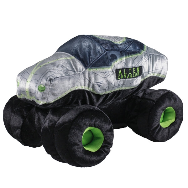 Plush stuffed Monster Jam truck made of soft velour featuring the Alien Invasion truck paint scheme. Measures approximately 8"x13".