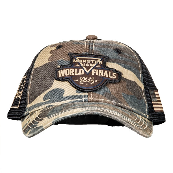 Celebrate the 2025 Monster Jam World Finals with the Monster Jam World Finals 2025 Camo Hat. This hat's stylish camo design features a subtle Monster Jam World Finals logo on the front with an American Flag and special Salt Lake City logo on the sides of a breathable mesh back.