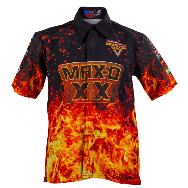 Relive the 20th Anniversary of the fan favorite Max-D truck with this commemorative replica youth driver's shirt! This Shirt features a special Max-D 20th anniversary logo across the chest over a black and flame design. This shirt is available in youth sizes