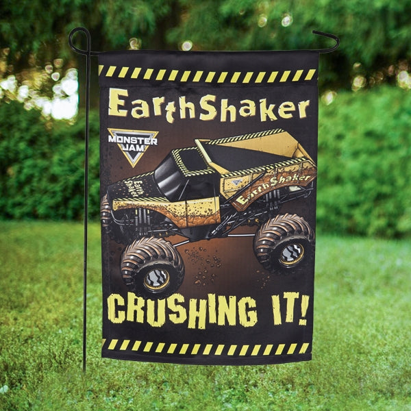 Rev up your yard with the EarthShaker Garden Flag! This garden flag features the EarthShaker truck, the iconic logo, and the tag line "Crushing It!"