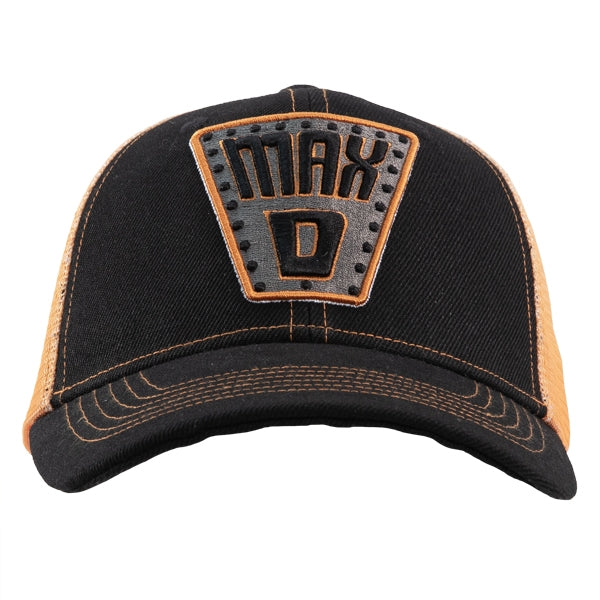 This Max-D hat features the Max-D logo on the front, orange gradient on the side and back, and an adjustable snap back closure.