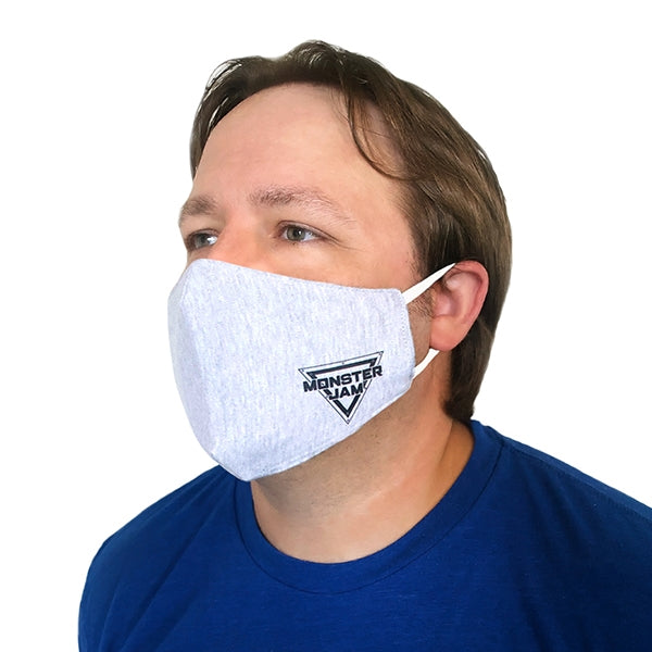Light grey cloth face covering with the Monster Jam logo screen printed in black on the left side.