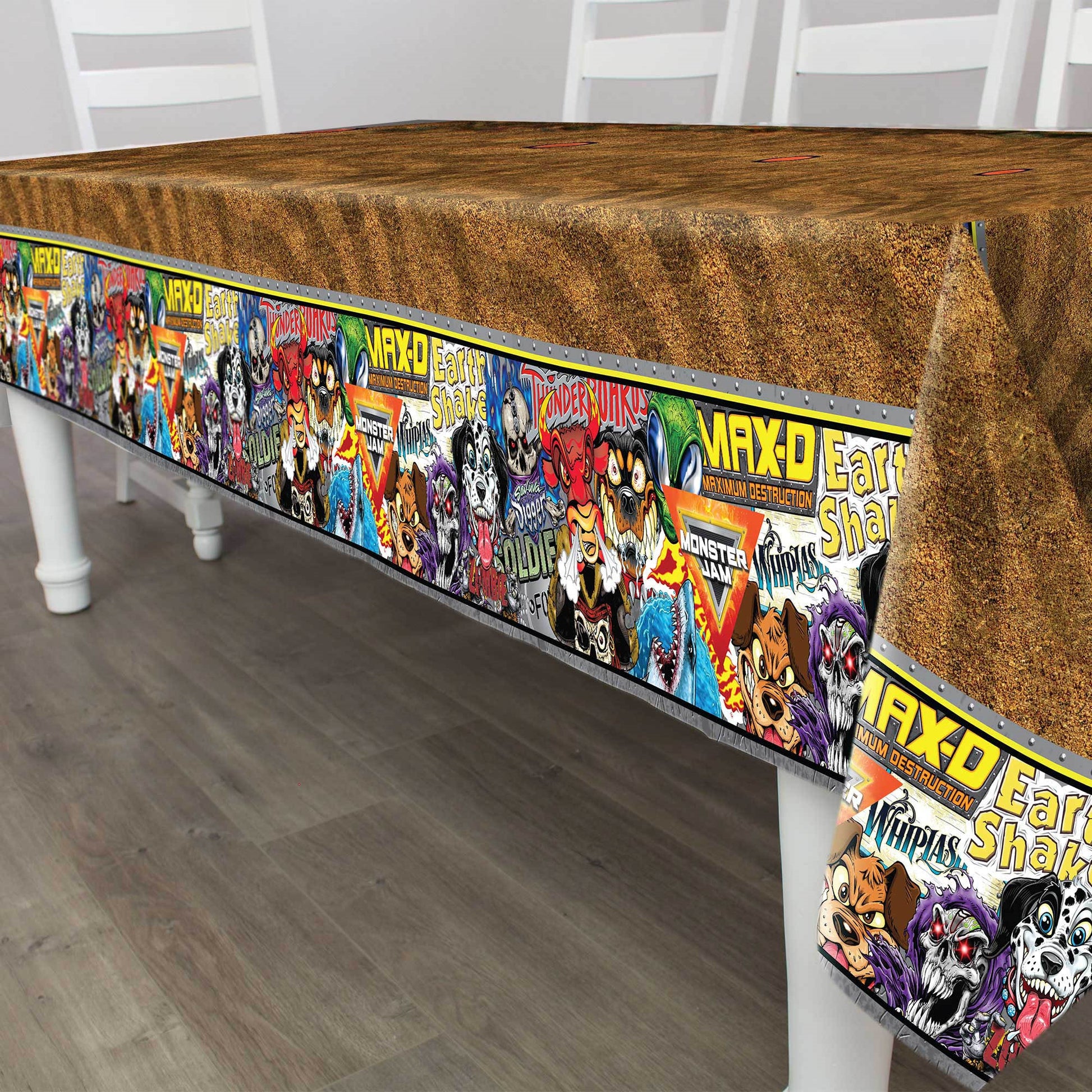 Keep the party area looking its best with the plastic tablecloth, measuring 54" x 108". The 16 three-ply luncheon napkins and 16 three-ply beverage napkins ensure that every messy moment is handled with ease. Plus, the 75" wide jointed flag banner provides the perfect backdrop for capturing the excitement and energy of Monster Jam.