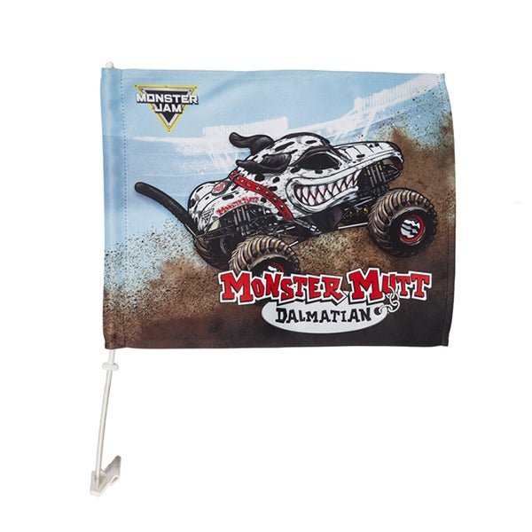 Add this Car flag to arrive to the Monster Jam event in style! This flag features the Monster Mutt Dalmatian truck and logo and it includes a car post with window clip.