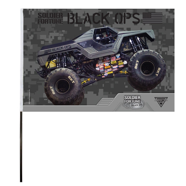 Flag featuring an action picture of the Monster Jam Soldier Fortune Black Ops truck.