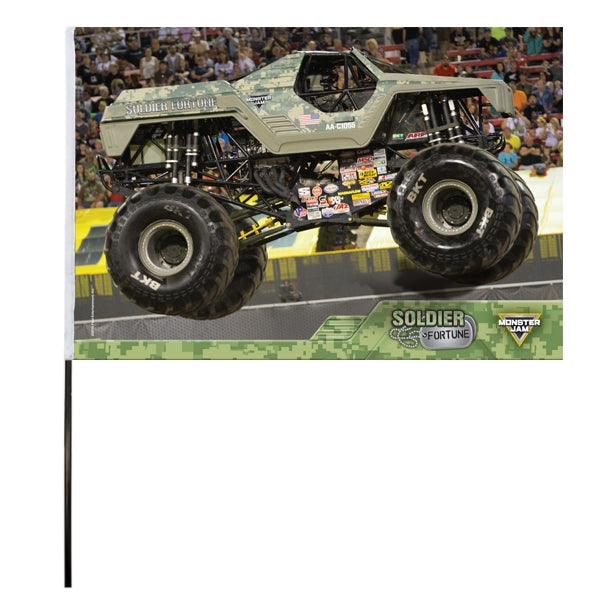 Flag featuring an action picture of the Monster Jam Soldier Fortune truck.