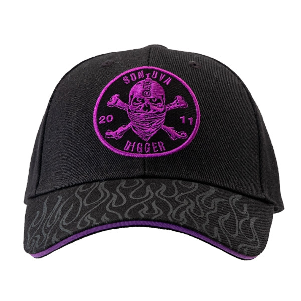 This Son-Uva Digger hat features the Son-Uva Digger logo on the front with a flame detailed curved bill and adjustable snap back closure.