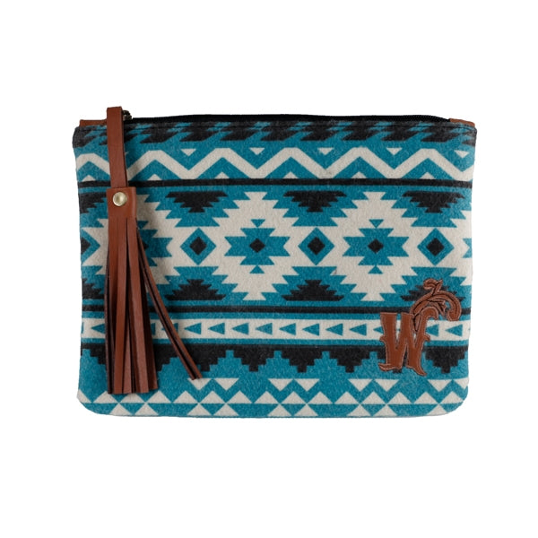 Aztec pattern wool clutch with zipper close top and tassel along with an interior zipper pocket. Whiplash logo featured on the bottom left corner. Measures 7 x 10 inches.